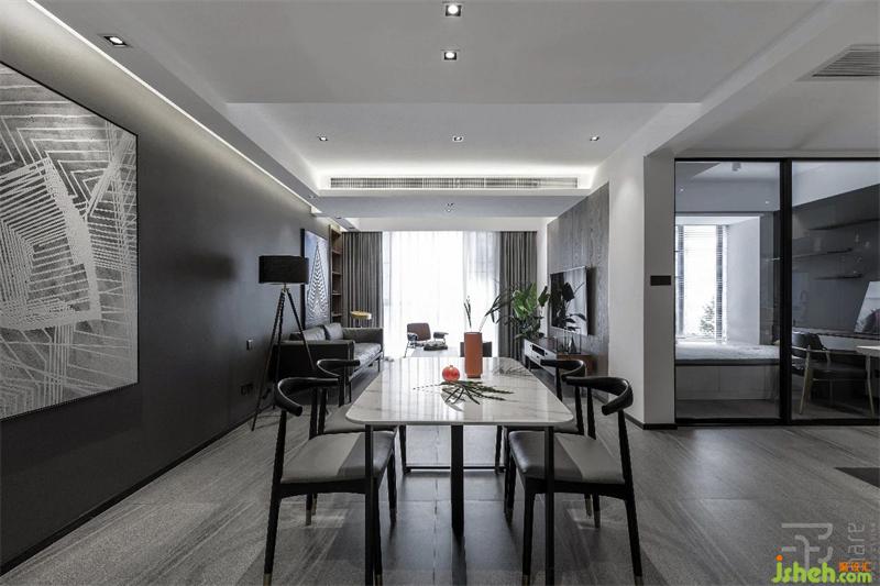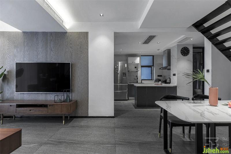 客厅空间定制的内嵌格子柜,将空间利用率做到最大化。电视墙以木饰面板搭配乳胶漆,沙发背景墙一直延伸到餐厅的深灰色墙面,使客厅空间更加温和内敛。