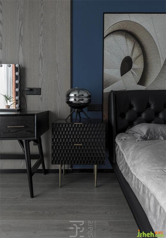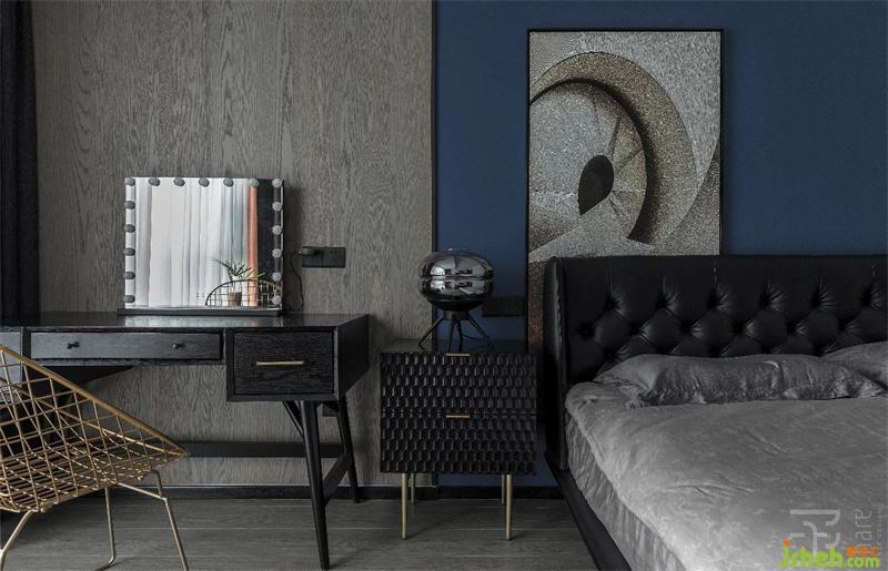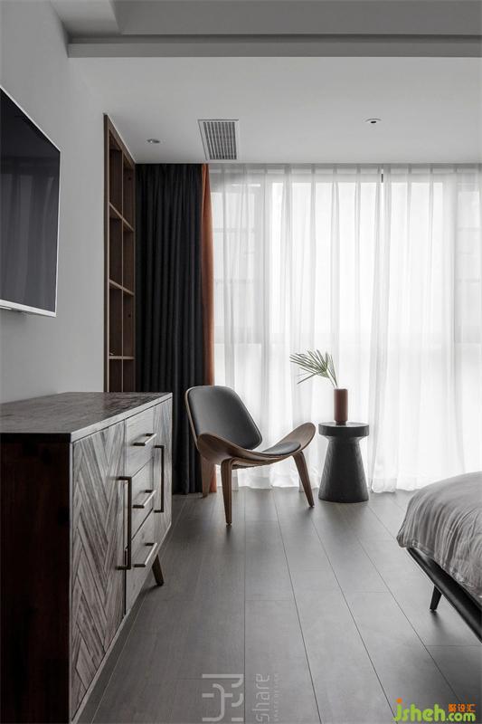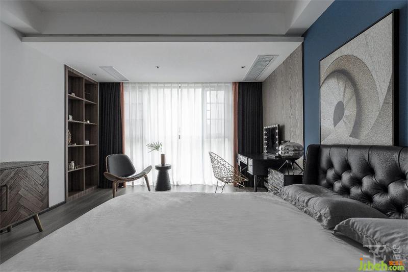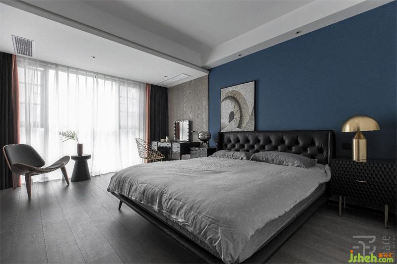 独立的衣帽间使主卧空间得到了大大的解放,舒适的休闲区,撞色的窗帘配色与床头背景相呼应,内嵌的格子柜充分利用了墙壁空间,还满足了储物。