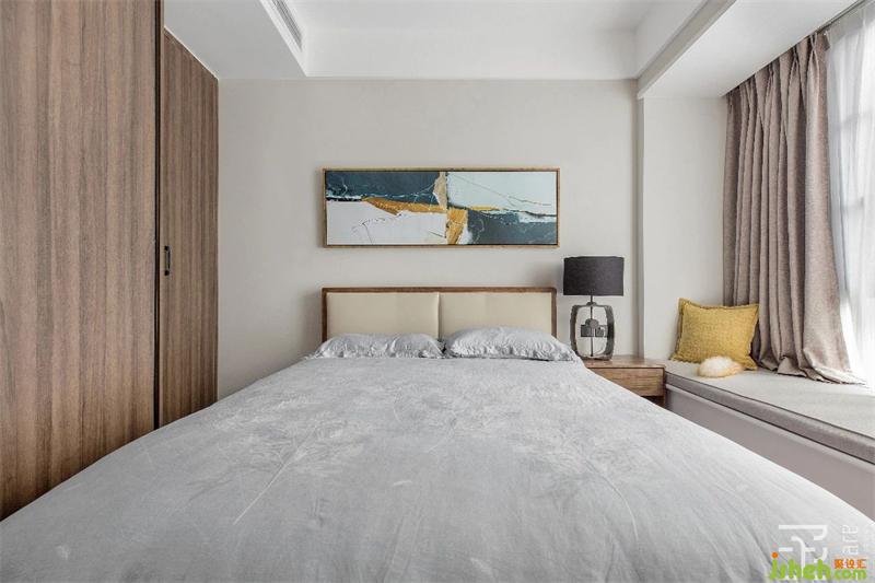 长辈房充分利用空间增加了储物区,飘窗做了软垫,父母可以坐在上面休息、看书等;整体采用明亮的色调更增加了温馨的感觉。