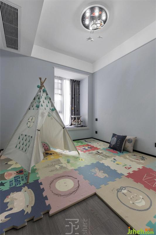 儿童房暂时没有做空间布局,而是敞开做了宝宝的玩耍空间;因为宝宝还比较小,暂时不会自己单独居住;同时,房间也保留了该有的基础功能,等宝宝长大了直接摆进家具就可以使用。