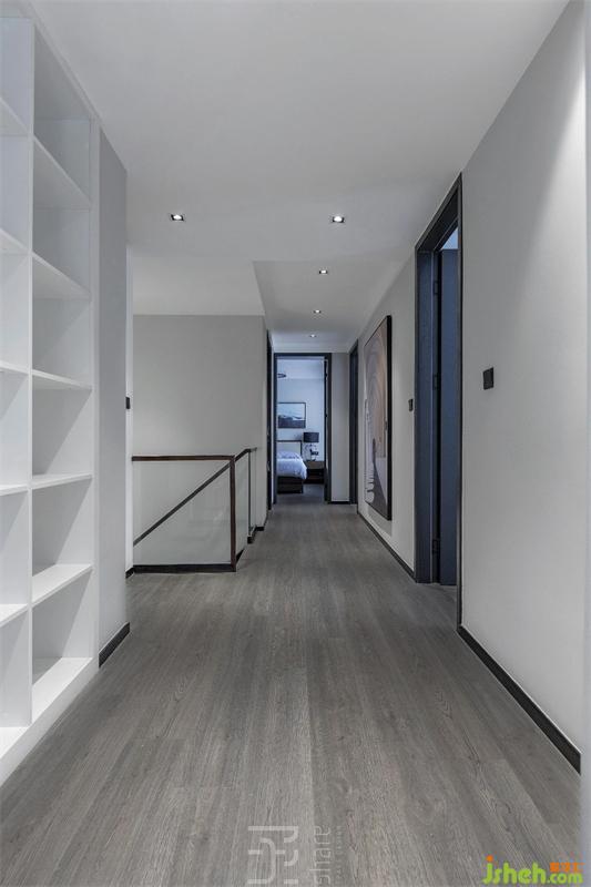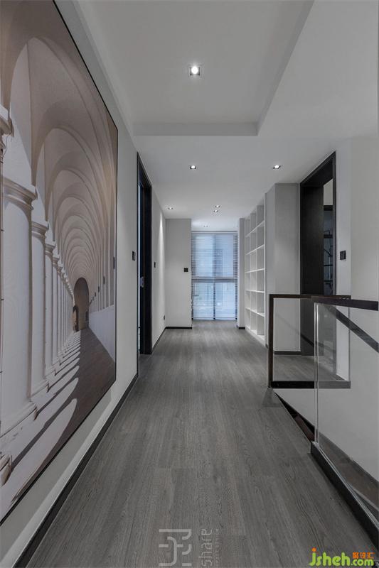 二楼楼道原本唯一的采光区域在卫生间,将原有的卫生间位置打开;将后面落地窗户纳入楼道区域,使整个空间采光得到改善;楼梯采用轻巧的材质,使整个空间更加通透明亮。