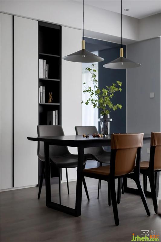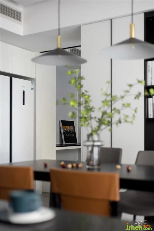冰箱、书柜、餐桌,巧妙的融合在一个空间里,不仅省空间,也让家人有更多的时间相处。沙发后的矮柜,既能储物,又恰到好处的隔开2个空间。整体与客厅相连,扩大视野,但又是可以独立操作空间。