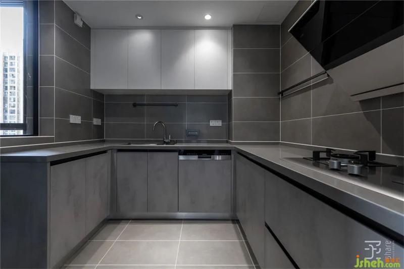 灰色的厨房空间,难得的U型橱柜,将冰箱放到餐厅,空出更多的厨房操作空间。那些我们不曾说出口的爱,有一半藏在了厨房的时光碎片里,忙碌是,期待更是。