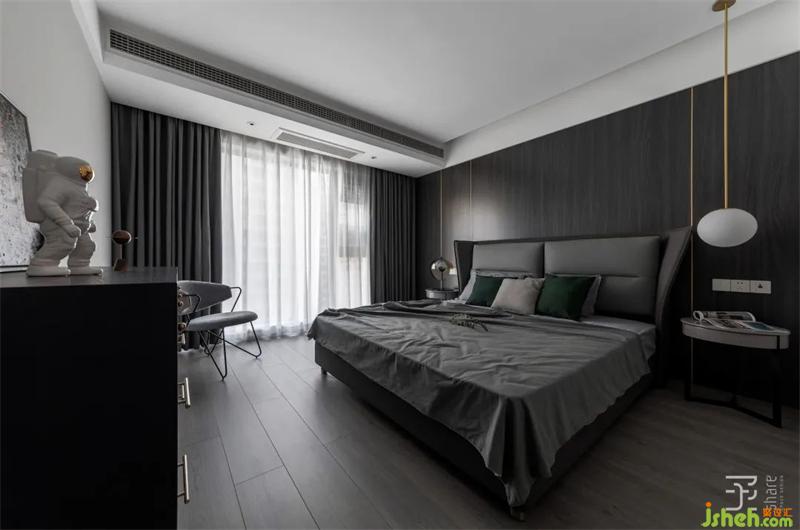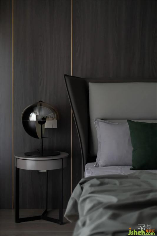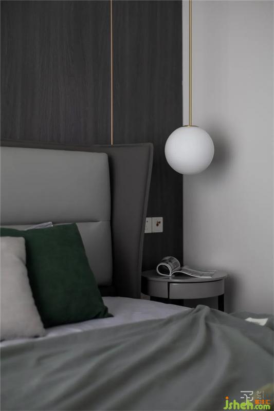 包裹性很好的大床,在深灰背景墙的映衬下,仿佛使你置身这种舒适的空间中,但又踏入了原始的自然,让整个家都有一种惬意的舒适感,没有过多繁琐的造型却营造出会呼吸的居家生活空间。