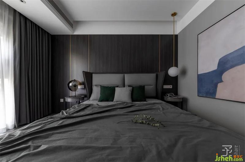 主卧床头背景,用深灰色的饰面板来装饰,简约而不单调。有别于以往的挂画方式我们将挂画放到了靠床的一边,简单而温柔的色调。