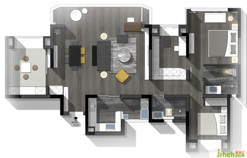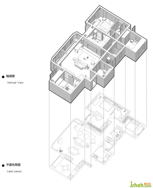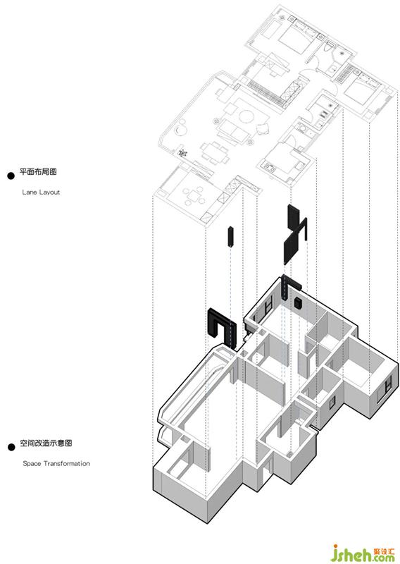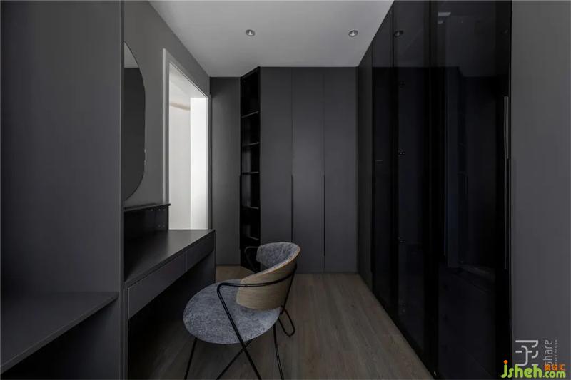 原房主卧没有单独的衣帽间,我们把原有次卧室与过道相邻的墙体进行拆除,并在原有次卧室与主卧室之前的墙体处开设门洞,把次卧打造为衣帽间空间。过道空间的墙面空间做成与衣帽间相邻的双面柜,一面为衣帽架的衣柜,一面为杂物柜兼部分展示柜功能。
