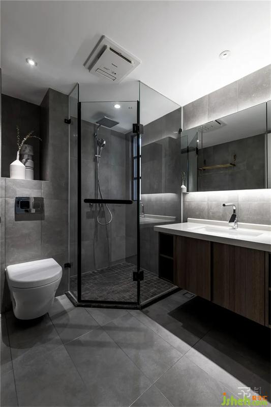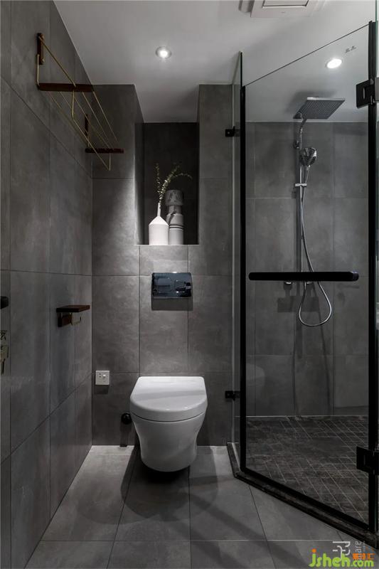 卫生间保持简洁的装饰手法,菱形的淋浴房,嵌入式的马桶,精致的五金挂件,无不体现细节美。精准,简单明了的色彩运用,是这个案例的特色所在,不多不少刚刚好。