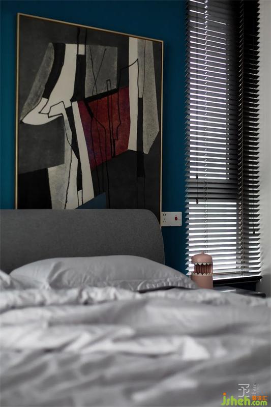 卧室背景墙上半露的抽象涂鸦装饰画,与整个空间既融合又碰撞。不仅与整体色系相协调,更增加了卧室的精致感。成都家居设计灰色棉麻床品让需要真正休息放松的人们达到它最大的目的,拉上蓝色遮光窗帘,即使在耀眼午后也能沉沉的睡一觉。