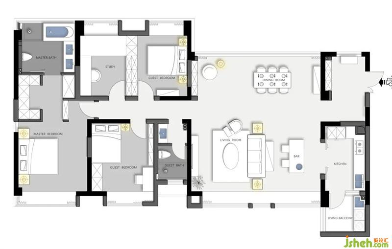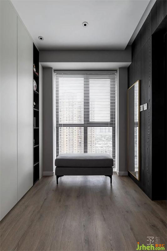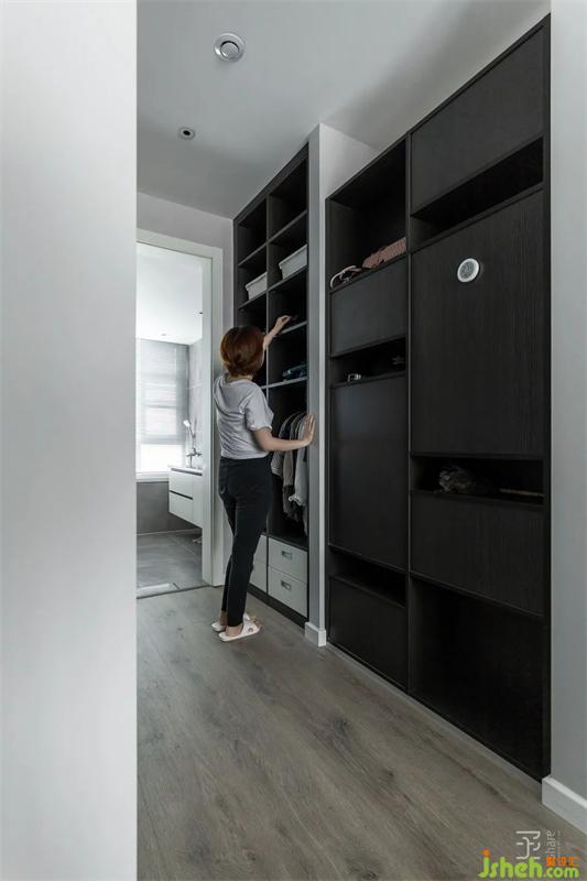 原本从主卧进卫生间的空间通道尺寸很小,而且衣帽间也很小,不方便使用。通过对墙体的拆除,将衣帽间的空间打开,在进门处设置玄关柜,把衣帽间与卫生间结合在一起,让空间动线更为方便,同时空间也更加开阔。