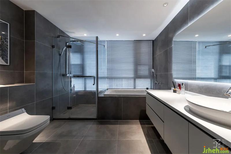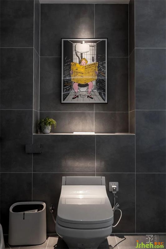 配合整体的格调,卫生间选用深灰色的瓷砖,搭配白色台盆柜让空间舒爽干净。用最简单的细边框磨砂隔断分割出若隐若现的私密空间。马桶背后的个性挂画,戏虐中又带着一些轻松感。