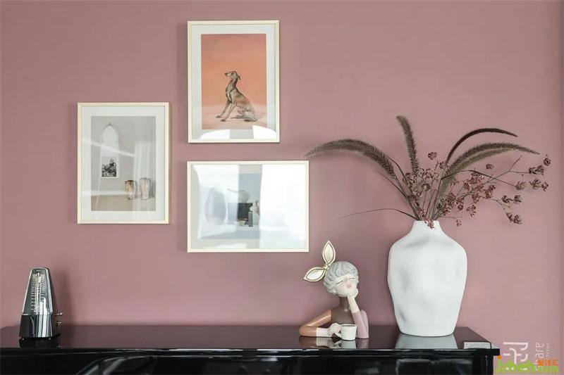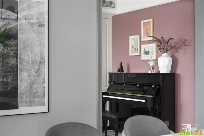 淡淡的粉色与女儿房相互响应,优雅的钢琴搭配质感的花瓶摆件,在金色边框的装饰画的映衬下格外美好,隐藏的玻璃推拉门使得琴声悠扬的充满整个空间。