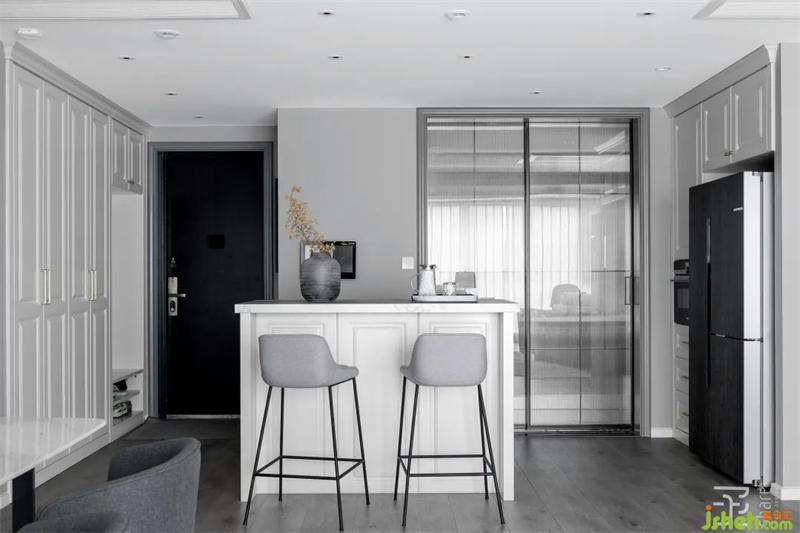 成都家居设计师将原本的厨房区域向生活阳台展开,使得中西厨在空间中完美融合,而生活阳台区域被巧妙得隐藏在诺大的客厅阳台一角。扩大了的可隐藏的厨房门使厨房如同开放式厨房一样融合在整个公共空间内。西厨的设计与公共空间风格相辅相成,早餐的开始,从厨房到西厨围绕着吧台吃着简餐,一家人的理想生活徐徐展开。