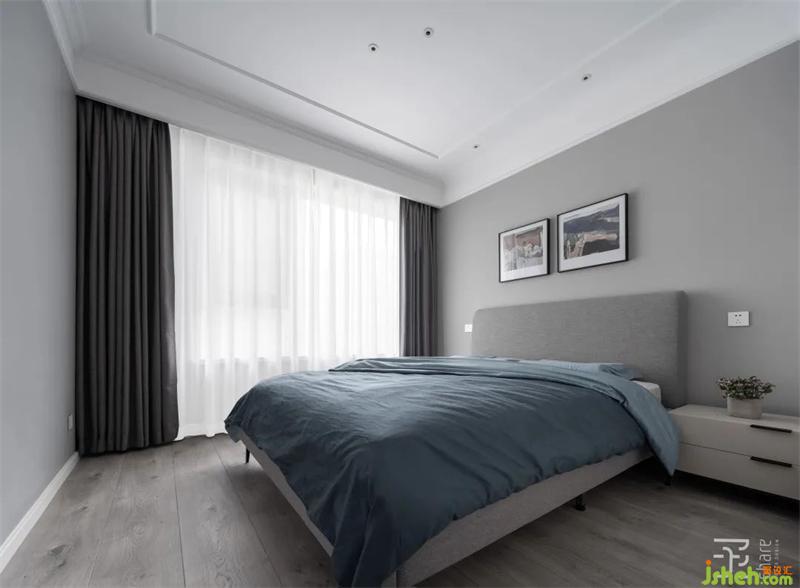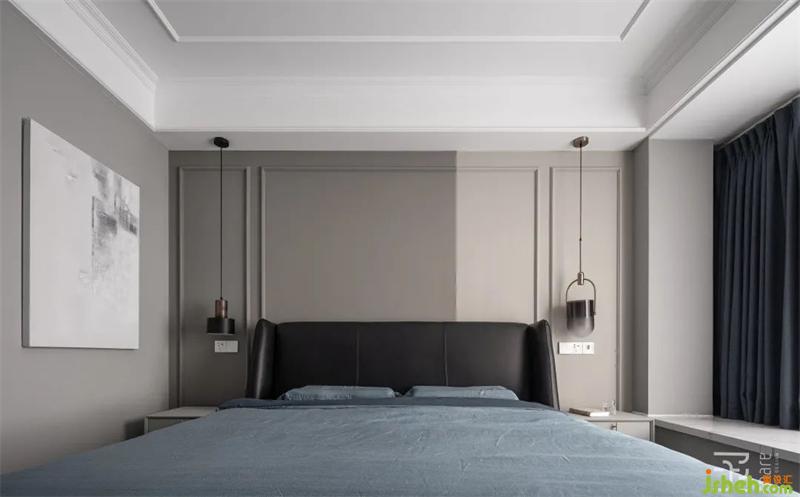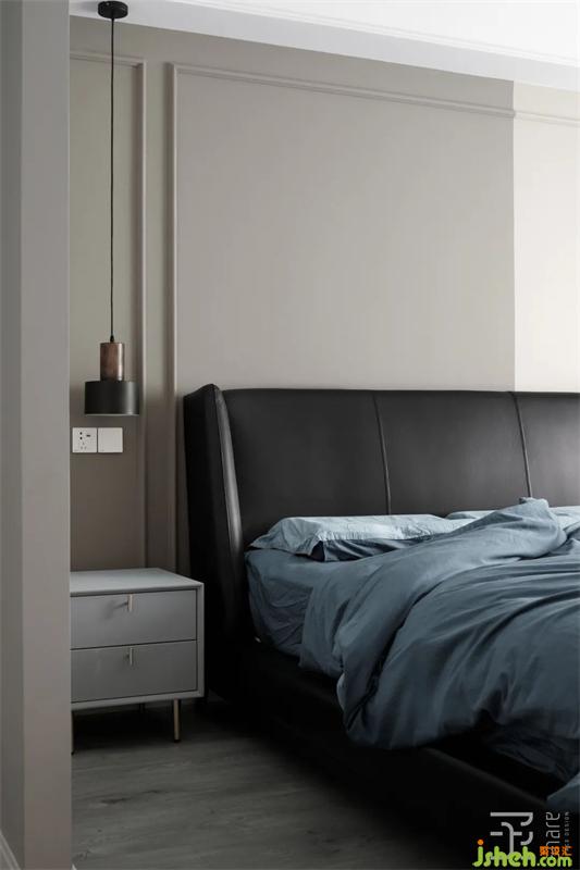卧室墙面是干净的浅灰色,深灰色的床与边柜加以点缀,中和浅灰的轻盈。无主灯的设计不但能满足视觉效果,同时也能满足审美需求。
