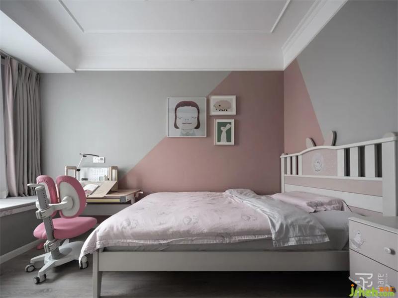 稚嫩少女心的粉灰撞色搭配可爱的床头以及童趣的装饰画,让人想要回归童年。