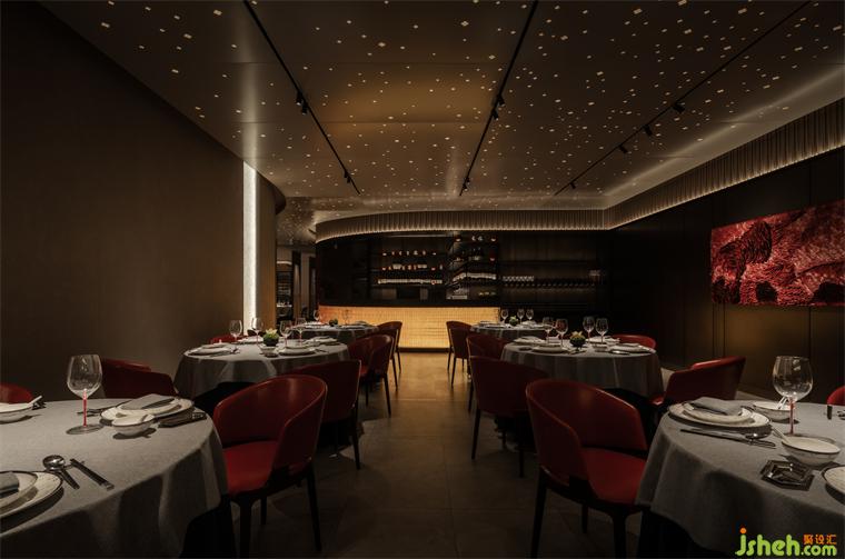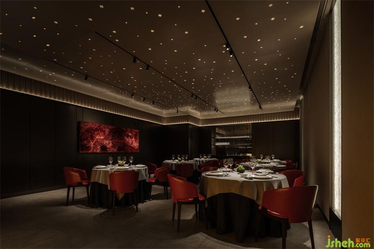 宴会厅顶部则隐藏着另一个世界,漫天星光以柿花的形态呈现,稍显不真实的朦胧浪漫之感,行走其中,仿佛和现实生活中的钢筋水泥相隔离,实现独特的就餐体验。