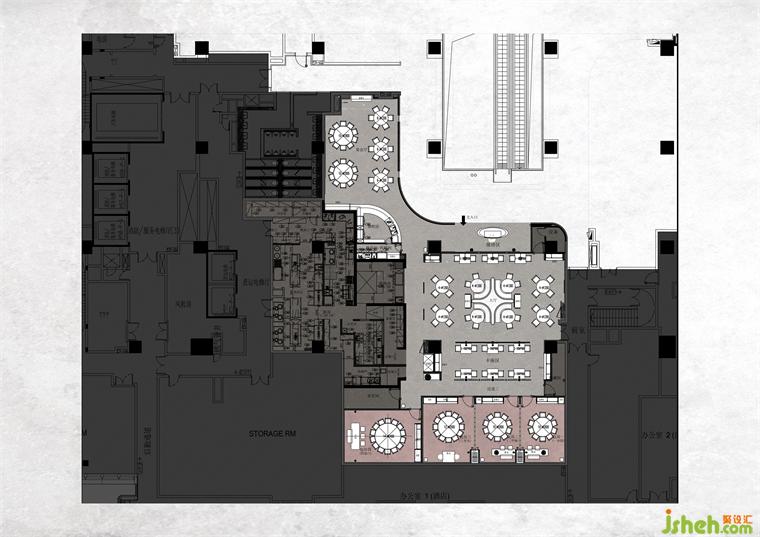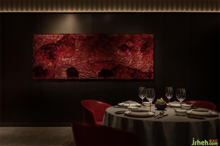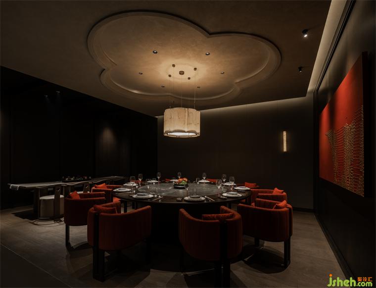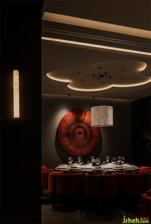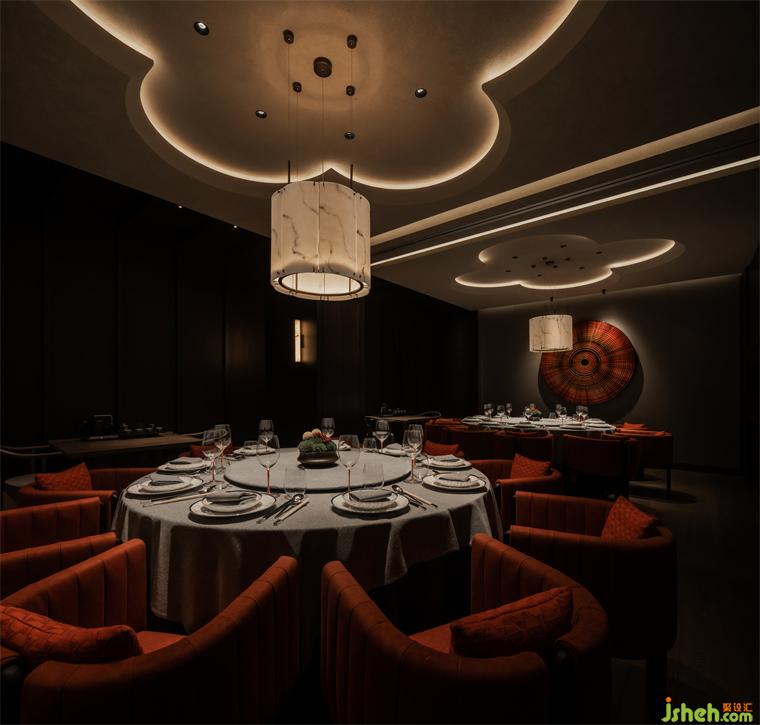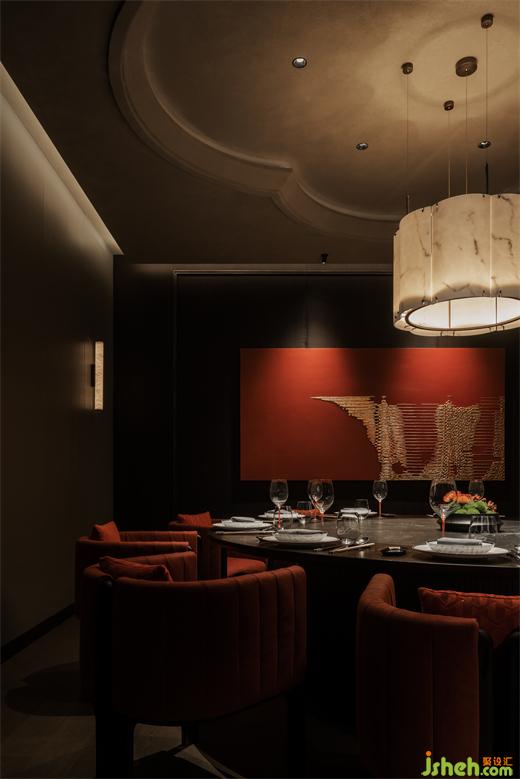 节奏清晰的空间动线排布,串联为彼此贯通的区域。餐厅设计包房内的柿花形态顶部和云石材质的吊灯交相辉映,为空间注入别样的艺术氛围。室内的艺术品和红色锯齿纹椅搭配,给予包房内独特的个性美学,让其成为一个神秘的小世界。