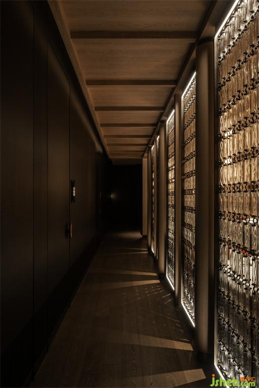 餐厅设计空间吧台区利用橘色灯光的玻璃砖和格栅下幽暗的灯光碰撞,弱化整体空间分离感,同时又透露着神秘感,激发食客探索的好奇之心。