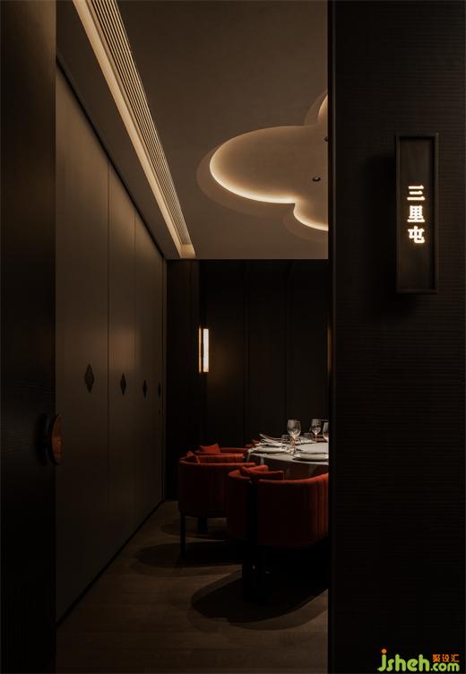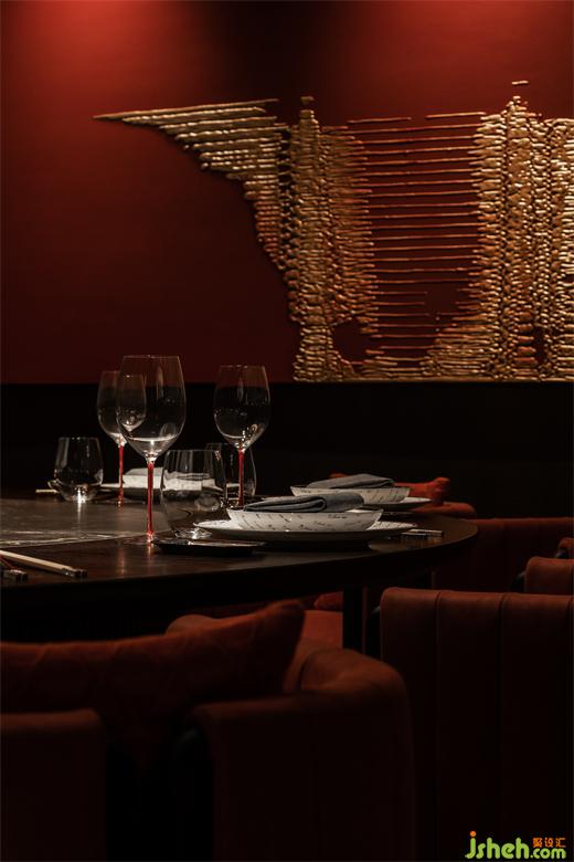 回归场域的构建,从色彩、京味元素、材质的碰撞融合,餐厅设计展现空间功能的的创意性和功能性。