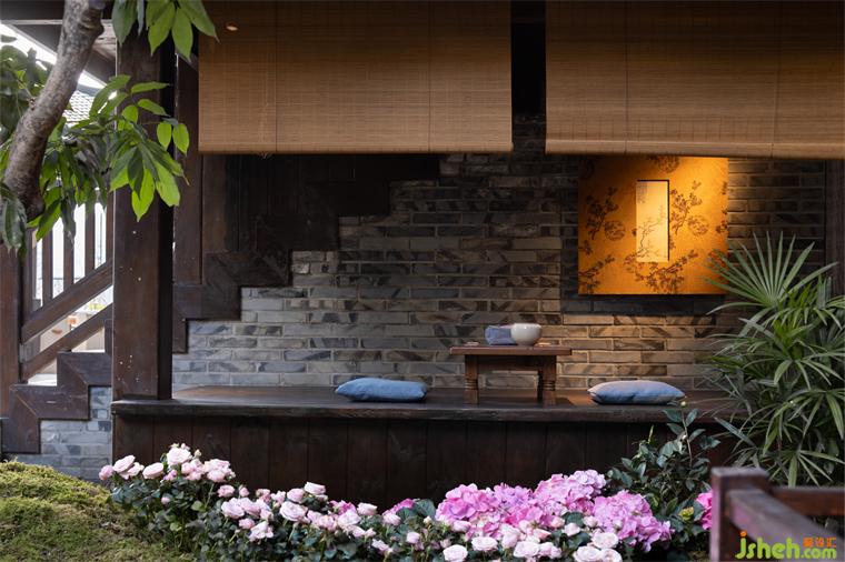 向外望去,重新划分的花园结构,透露着不问世事之喧嚷,感知暗含潜藏的美学气质。穿过青苔小径,树下以竹帘为媒的茶席空间,宛若一幅幅风格迥异的山水画卷,引人驻足流连。