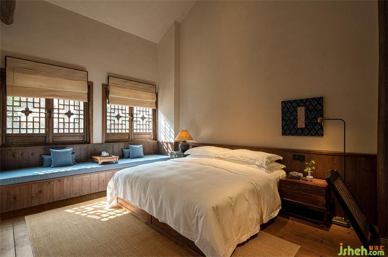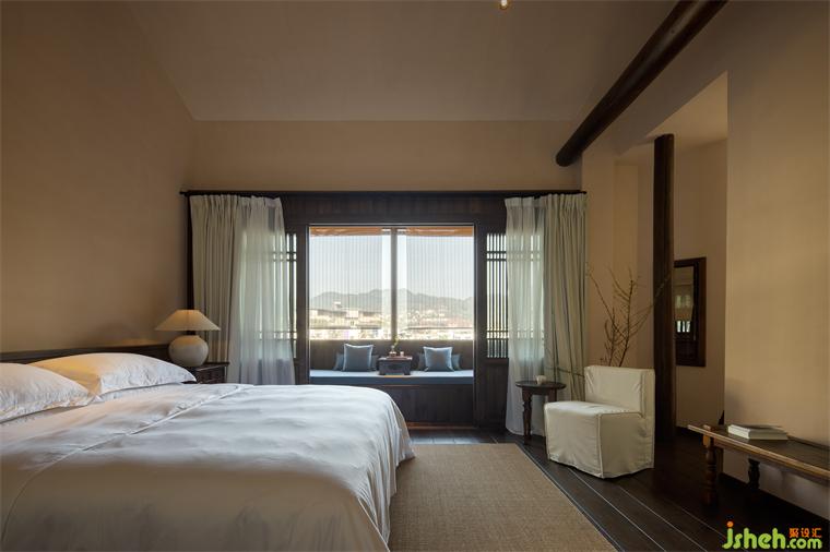 整体客房内部无多余杂色,布局古韵而又充满趣味,向外的软榻,给予居住者在空间内远眺的闲适。同时客房内部创建框架窗景,使窗外景成为室内不可或缺的一部分,客户可在此感知日光的流逝,也体现了设计师对时间和空间的思考。