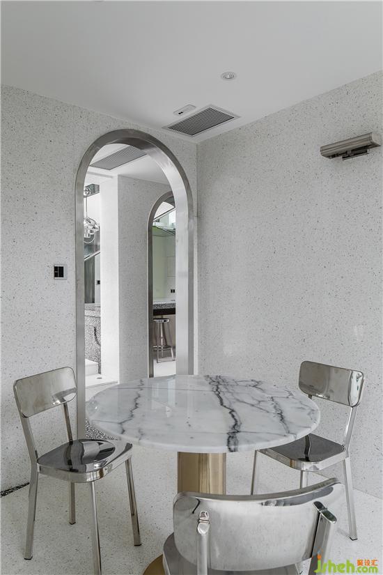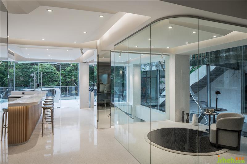 The open round door is wrapped with stainless steel to add senses of style, forming an open and smooth moving line. A semi open wall is set between the office and the window to enhance air convection and defuse space constraints.