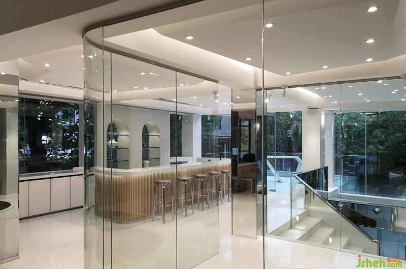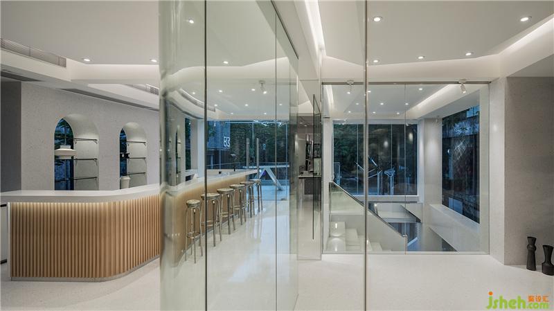 开放式圆栱门包裹不锈钢,增添潮流感,形成了开放、流畅的空间动线。办公室与橱窗之间设置了半开放墙,增强空气对流,巧妙化解空间局促。