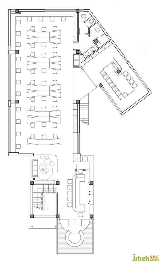会议室门口的消防楼梯,保留了原本的明黄色,制造视觉上的一抹惊喜。消防楼梯直通夹层的独立回廊,布置为吸烟区。充分利用鸡肋空间打造多元化休息区,为员工保留一片“灵感空间”。办公室设计