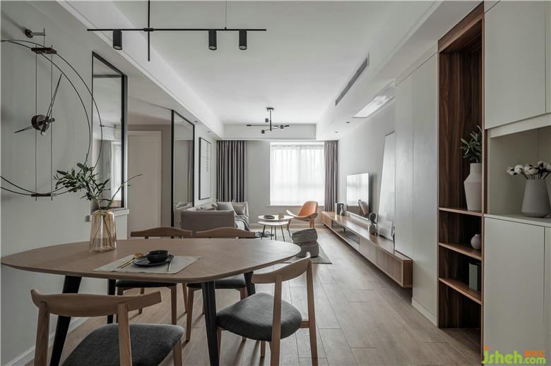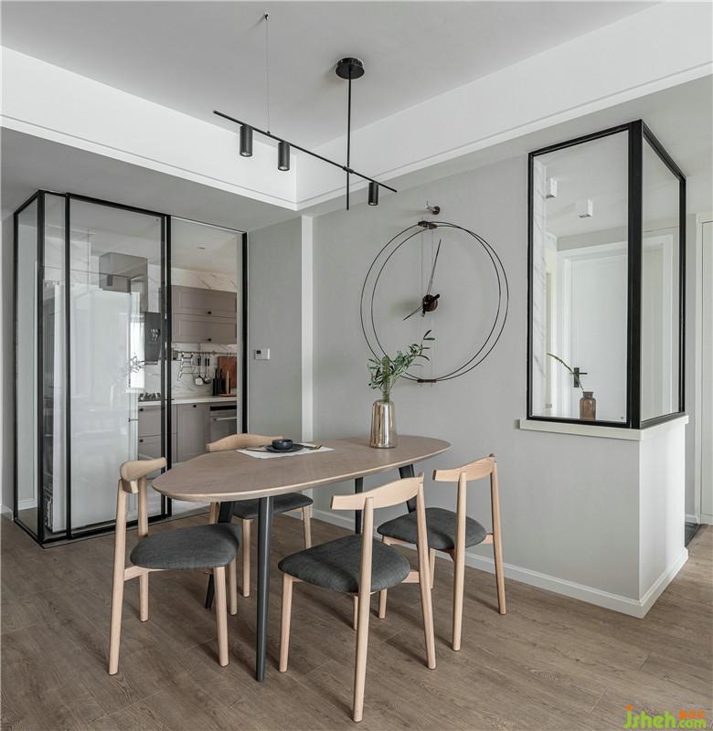 原有厨房墙体取而代之为一扇入户大镜面与两扇通顶玻璃移门,改变原来餐厅与厨房动向的同时,空间通风与采光效果大大提高,厨房或半开放或独立,赋予生活场景更多画面,餐桌选用不规则多边形,既能体现业主的居住品位,也让空间与众不同,充满更多趣味。家居装修