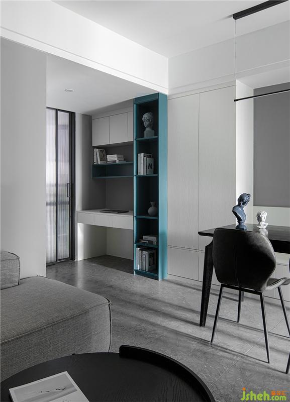 室内设计师将此空间划分书房与休息两大功能区。书房与餐厅空间连贯叠加,模糊界限,同时并建立进主卧过道区。休息区设置榻榻米,满足储物与睡觉功能,以极窄长虹玻璃双推门进行隔断,保证隐私的同时,也不影响光线的进入。