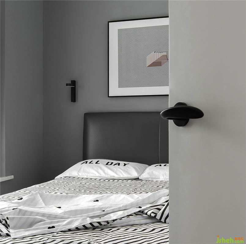 卧室空间尺度局促,调整门洞位置,侧面设计满墙储物柜,最大限度增加收纳。