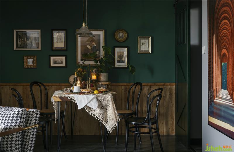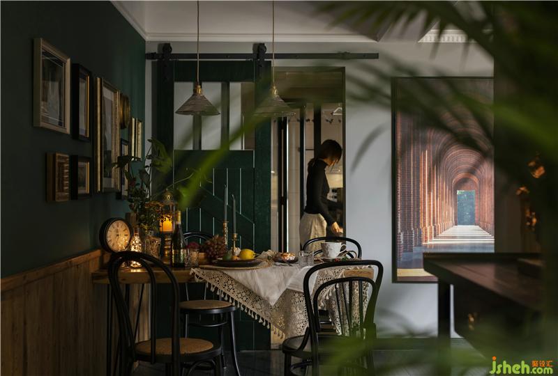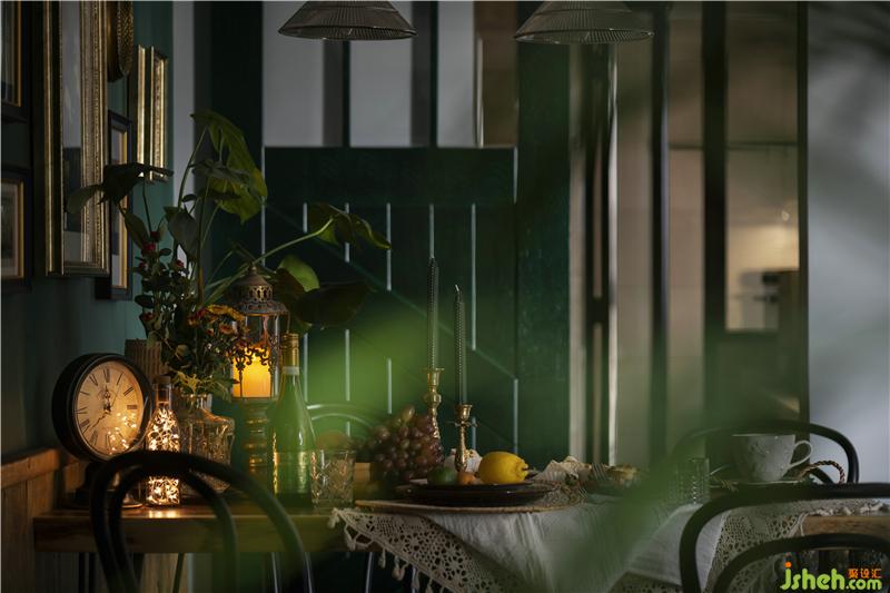 餐厅以暖色老木板与深绿色进行冷暖强烈对比,自然光影与氛围灯光交相呼应,电影画面感十足,餐桌上的食物在氛围的营造下色泽感强,食物在画面中更显的鲜美,一副饮食浪漫画面跃然而生。