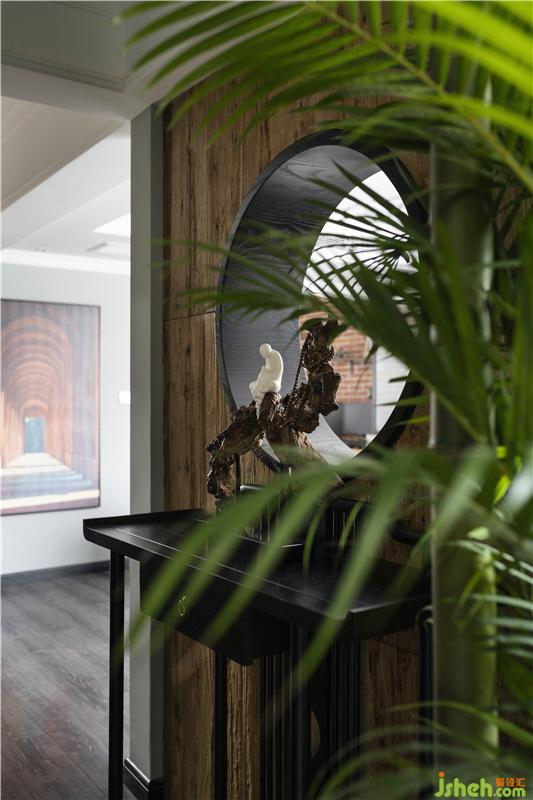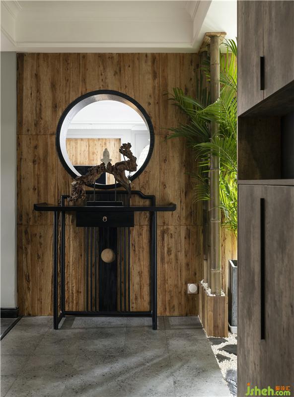 本案例中,室内设计师采用以暗淡的灰、黑色系为渲染的色调,移步于景,入户端景墙处以中式中心对称及框景手法,仿佛电影中镜头,捕捉圆环背面景色,墙面采用饱和度高的暖色老木板,侧面引入户外竹子与绿植,冷暖色系交相呼应,光与影的介入,给整个画面提升视觉冲击感,竹子下方门槛引入日式“枯山水”,青石板与白色鹅卵石搭配细节,让人心灵更加安静与自然。