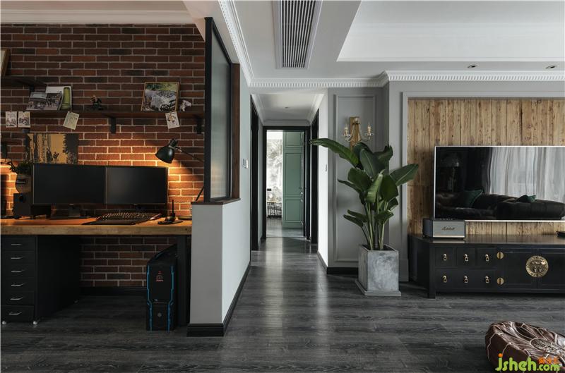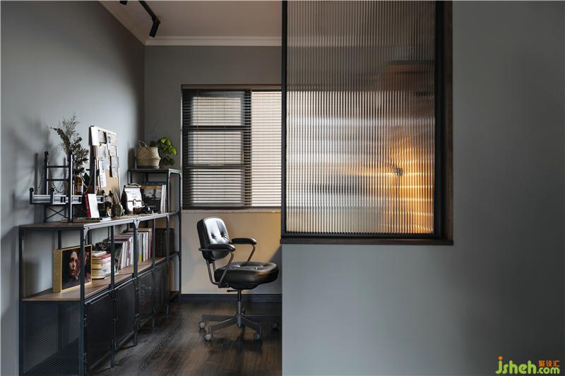 书房采用大面积红色文化石作为背景,为做动画设计专业的业主带来工作的激情,同时暖色灯光与自然光线的介入,斑驳凹凸的文化石更具立体感,怀旧情怀映入眼帘。室内设计师以长虹玻璃作为半隔断,光影与色彩透过玻璃若隐若现,书房与客厅形成情感沟通与互动。