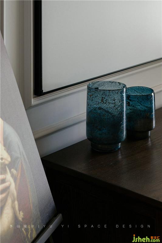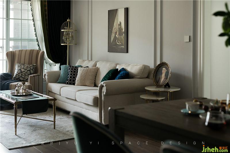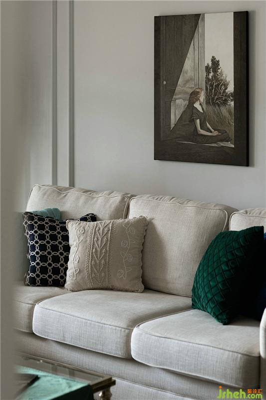 整齐有序的物件陈列映衬出屋主精致的生活状态,深蓝、深绿色的抱枕与浅色的布艺沙发在色相与明度上交相呼应,并形成冷暖色系对比,仿佛油画里的笔触,和谐、宁静。