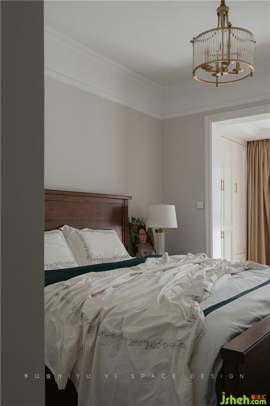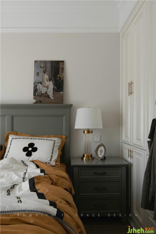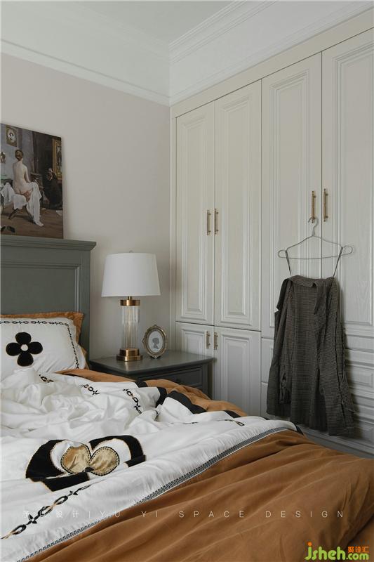 金色质感的衣柜把手、金色质感元素的台灯、油画装饰画与棕黄色床品进行组合搭配,格外的惬意。挂在柜门前方的衣服也成为了画面中装饰的一部分,自然、随性。