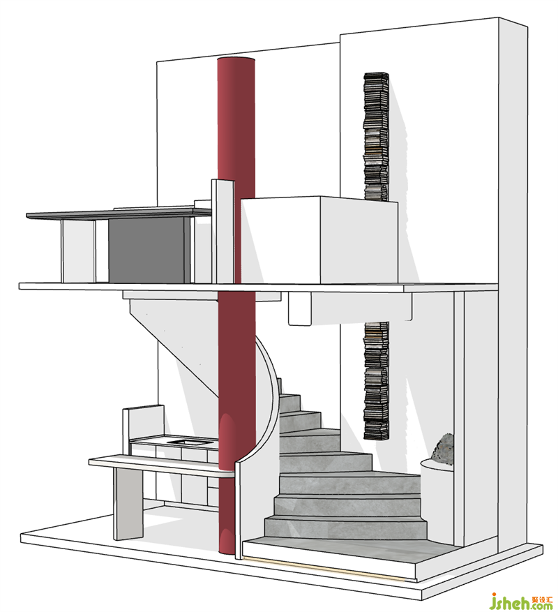 The cylindrical components are introduced to connect the space, and the functions are inserted by means of insertion, dislocation, superposition and continuation, so as to associate the spatial functions, enrich the spatial form and form a unified guidance.
