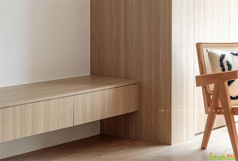 The semi-high wall panels of TV cabinets and sofas are interwoven with the "wooden box" of the balcony to express the structural form and make the space relevant. The continuation of wood makes the space more tension and ductility