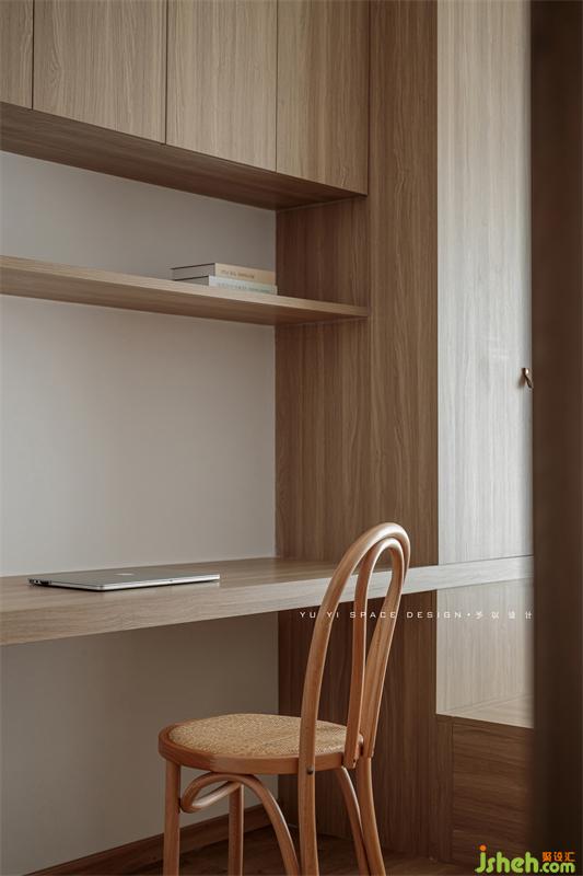 柜子的组合方式避免形式上的孤立单一,书桌台面与收纳柜设计穿插结构
