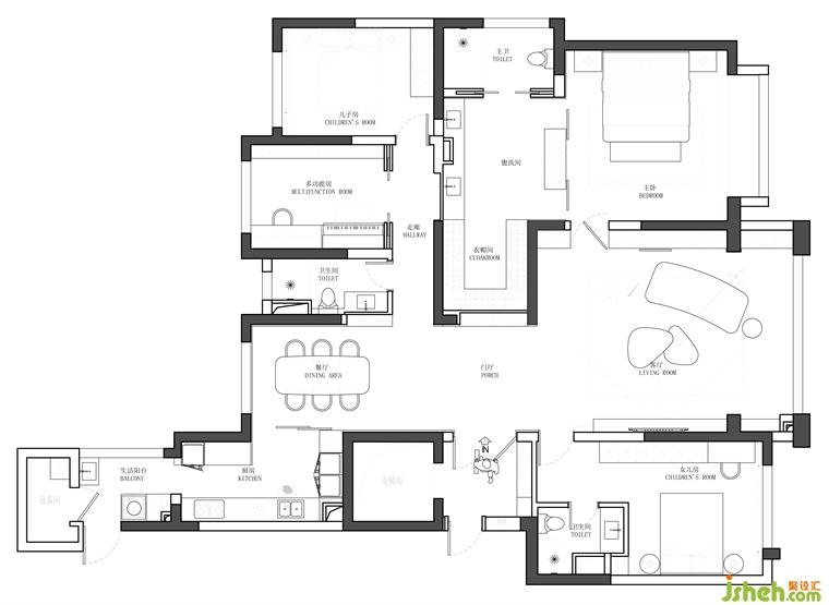 3.扩大厨房洞口,使空间比例得到延伸4.卫生间的布局调整,增加收纳空间
