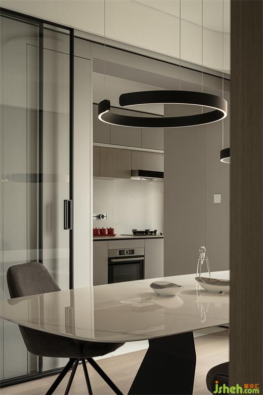 餐厨空间运用大面积的岩板,在结合整体氛围满足功能使用的同时,让空间的形体表现得更有节奏感。