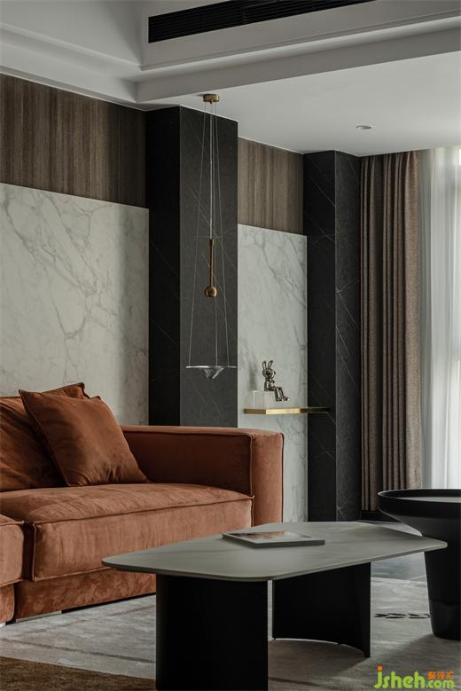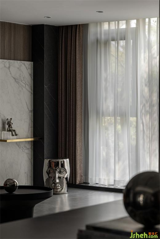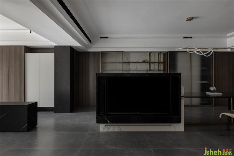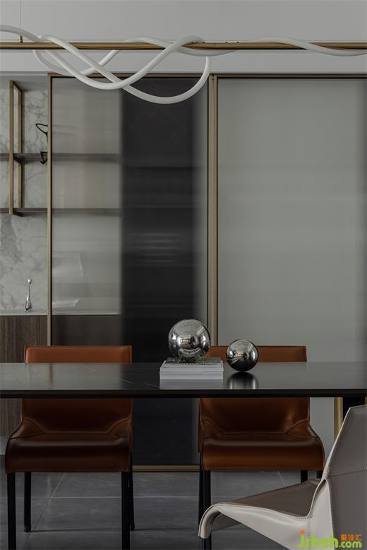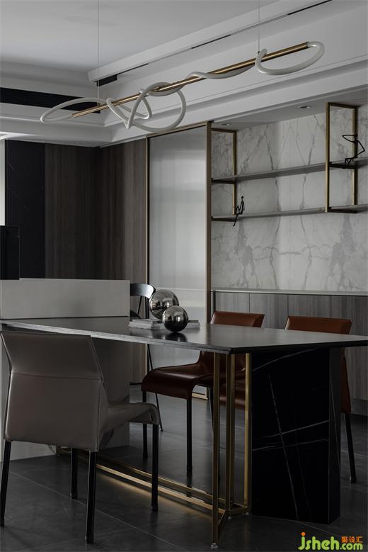 金色、银色金属材质与板材、岩板、石材材质进行碰撞,让空间质感增强。