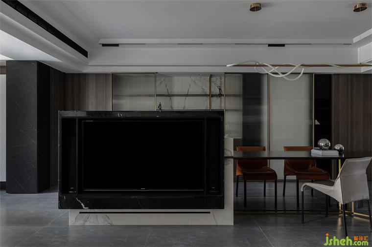 餐桌、岛台与简易电视墙体块叠加成整体。别墅装饰餐边柜与西橱柜结合,设计整面柜,吊滑门可移动于柜子前方任意位置,创造出柜体形式与视觉上的可变、多样性,实用与美观达到统一。