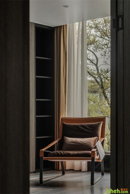 分户墙上方设计长形固定玻璃,巧妙把隔壁植物景观引入视线。三楼休闲区与二楼书房通过玻璃栈道形成空间的互动,创造出有趣的生活场景画面。