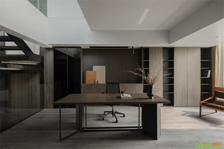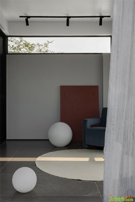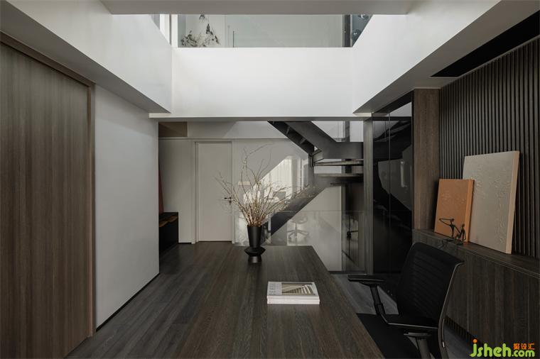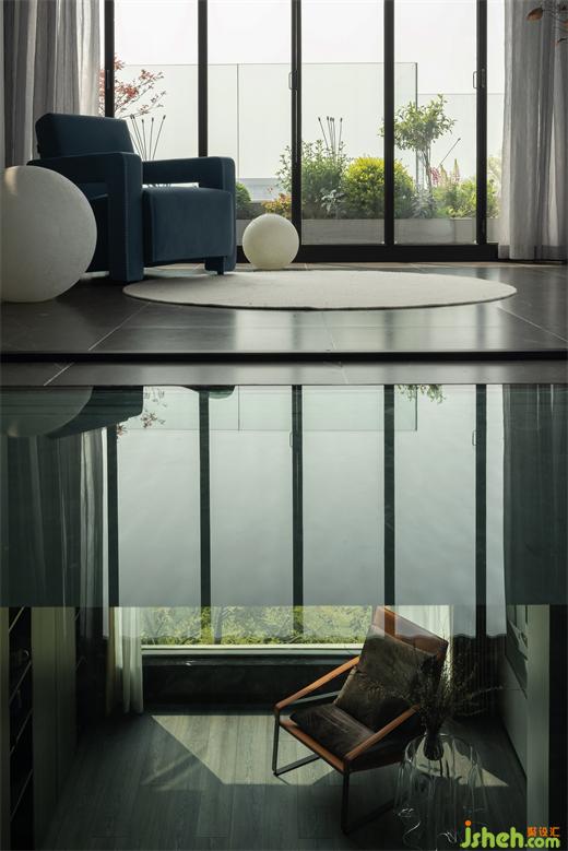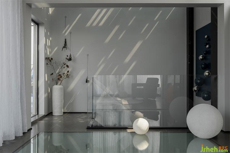二楼书房顶部打通,设计玻璃栈道,光线流入,随着季节和经纬度的不同,阳光照射的角度也随之变化,光线在空间内部自然流动,推移时光的影像。