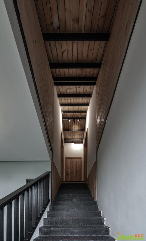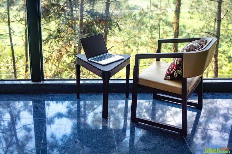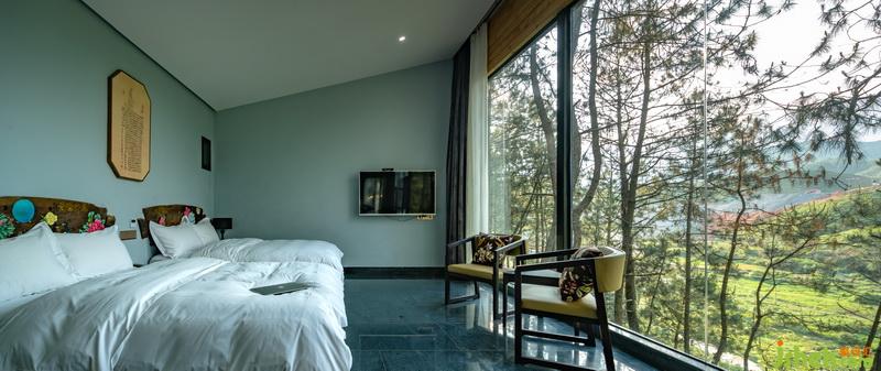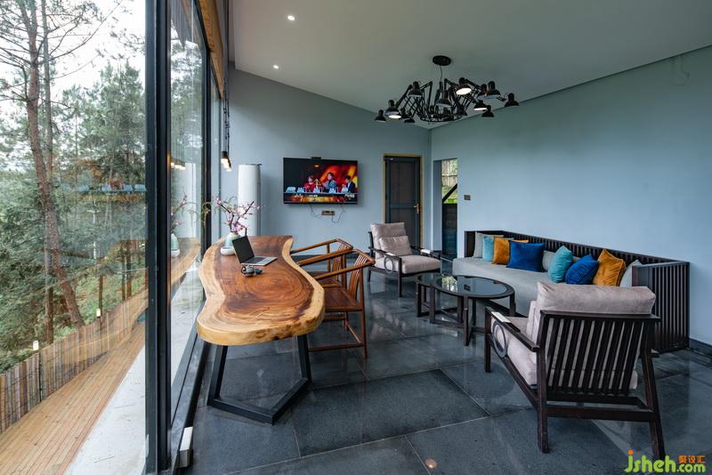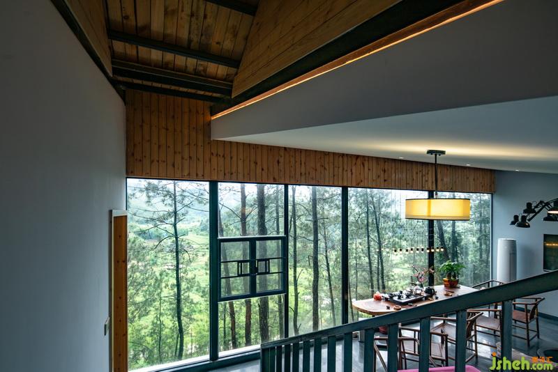 依山而建的两层小木屋,将每个空间都融入到松林树梢的奇特感受里。把最好的观景方向是全落地玻璃,乡野风情尽入眼底。