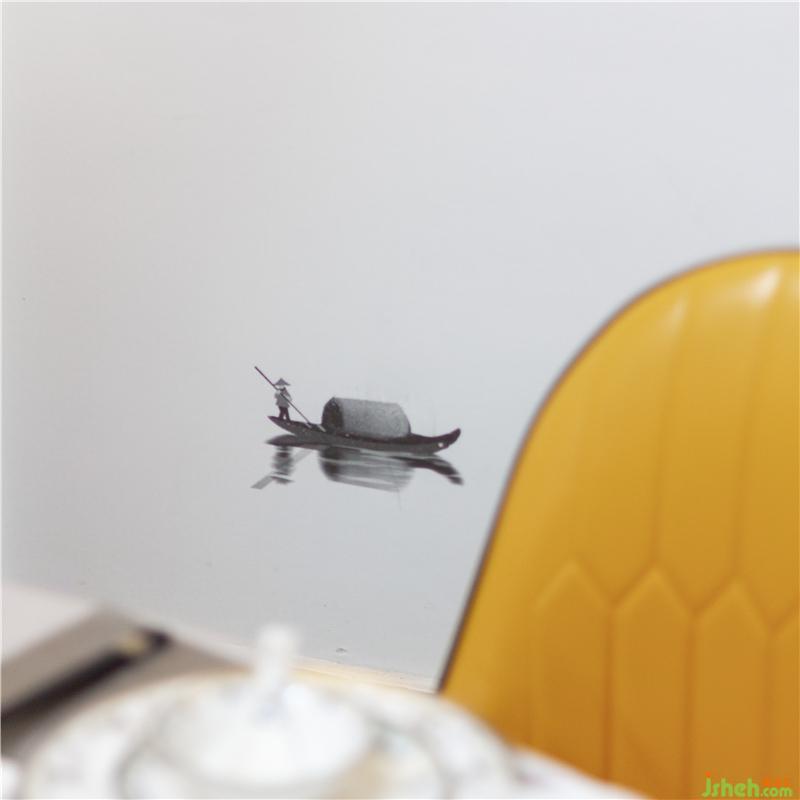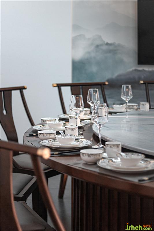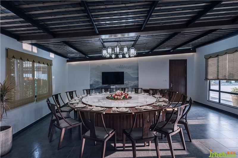 包间背景以多幅山水画为引,展现玲珑娟秀的梨园春色。渔人归来的特写,正好似“渔夫归来载夕阳,唯舟尽在柳丝乡。”的意境。