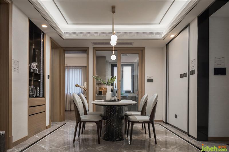 该项目客厅与餐厅呈开放式的格局,自然光透过落地窗纱照进,坐收借景,引光,为充满自然石材的餐桌注入了一丝细腻与温情,墙上一副融合了现代的装饰画,与餐桌呈现一个兼具艺术与生活气息的用餐区域。