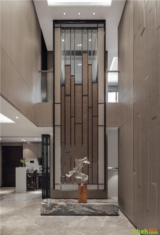 入口雕塑以流动回归的形式展现,底部大地色的根基象征着包容体现着稳重,上部晶石回旋扭动的形态表现了生命的流动感。从而让我们看到生长与回归的意识形态,与最终回归本心的意境。玄关处承接上下,勾连生活起居空间。