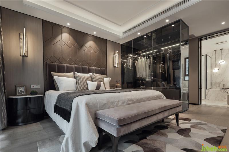主卧以灰驼色为主调,同色调软硬装营造温暖沉实的氛围。通透茶玻衣柜灵动了整个空间,流露出淡淡简致奢华之气。