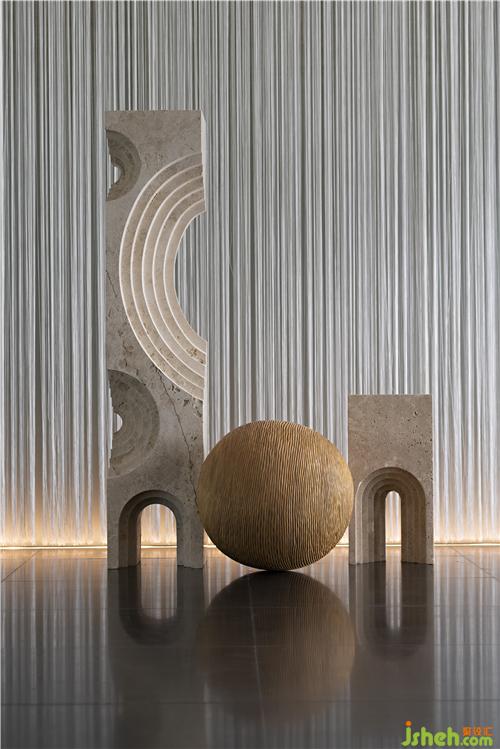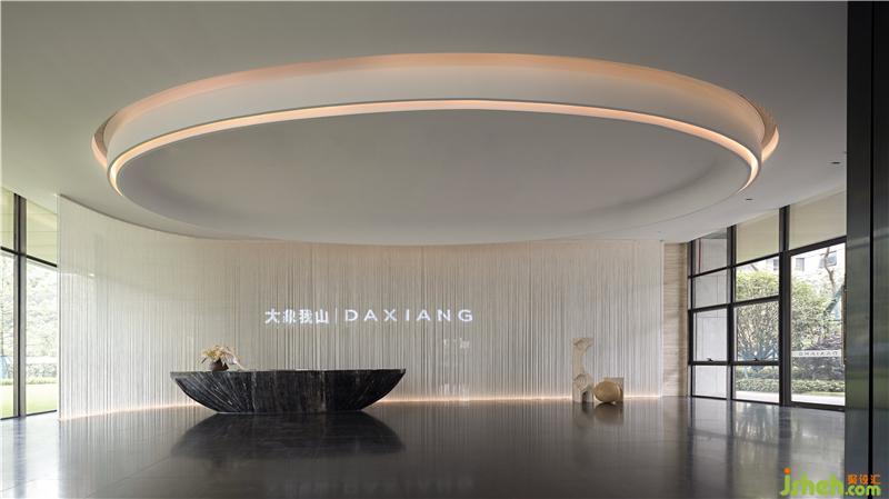 通过投射的光影、抽象元素,以此展现 “天圆地方 ”的观念;苏州售楼处设计环绕线条元素在二次平面上按照美的视觉效果、力学的原理进行编排和组合,堆砌出别有洞天的空间感受。